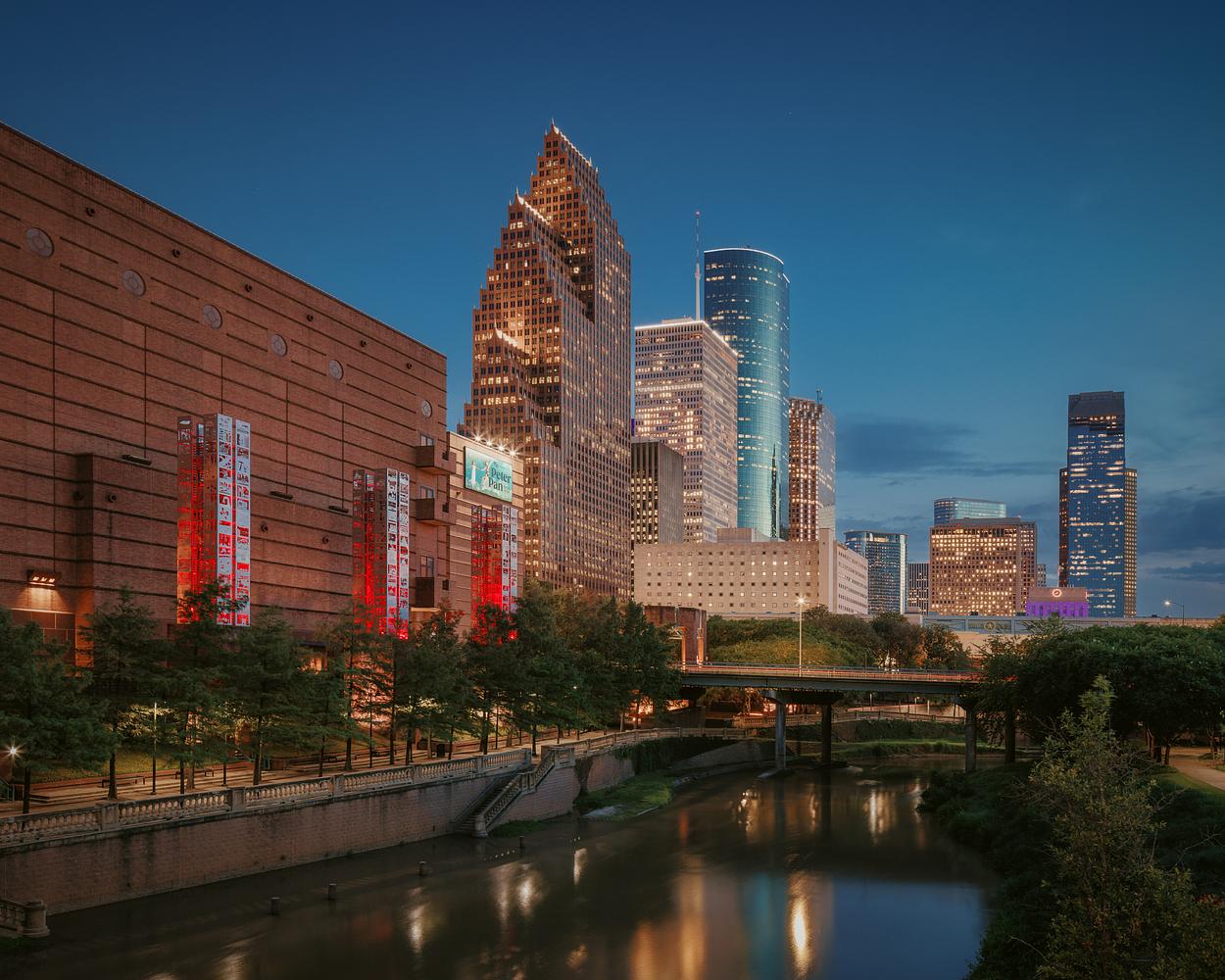 It's dusk in the city, and Buffalo Bayou reflects the lights from the towering buildings in the distance. Houston, Texas. 2023