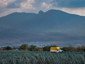 Distinctly Jalisco, the bountiful agave fields serve as the backdrop to the many tequilerias in the town of Tequila. Tequila, Jalisco. 2024